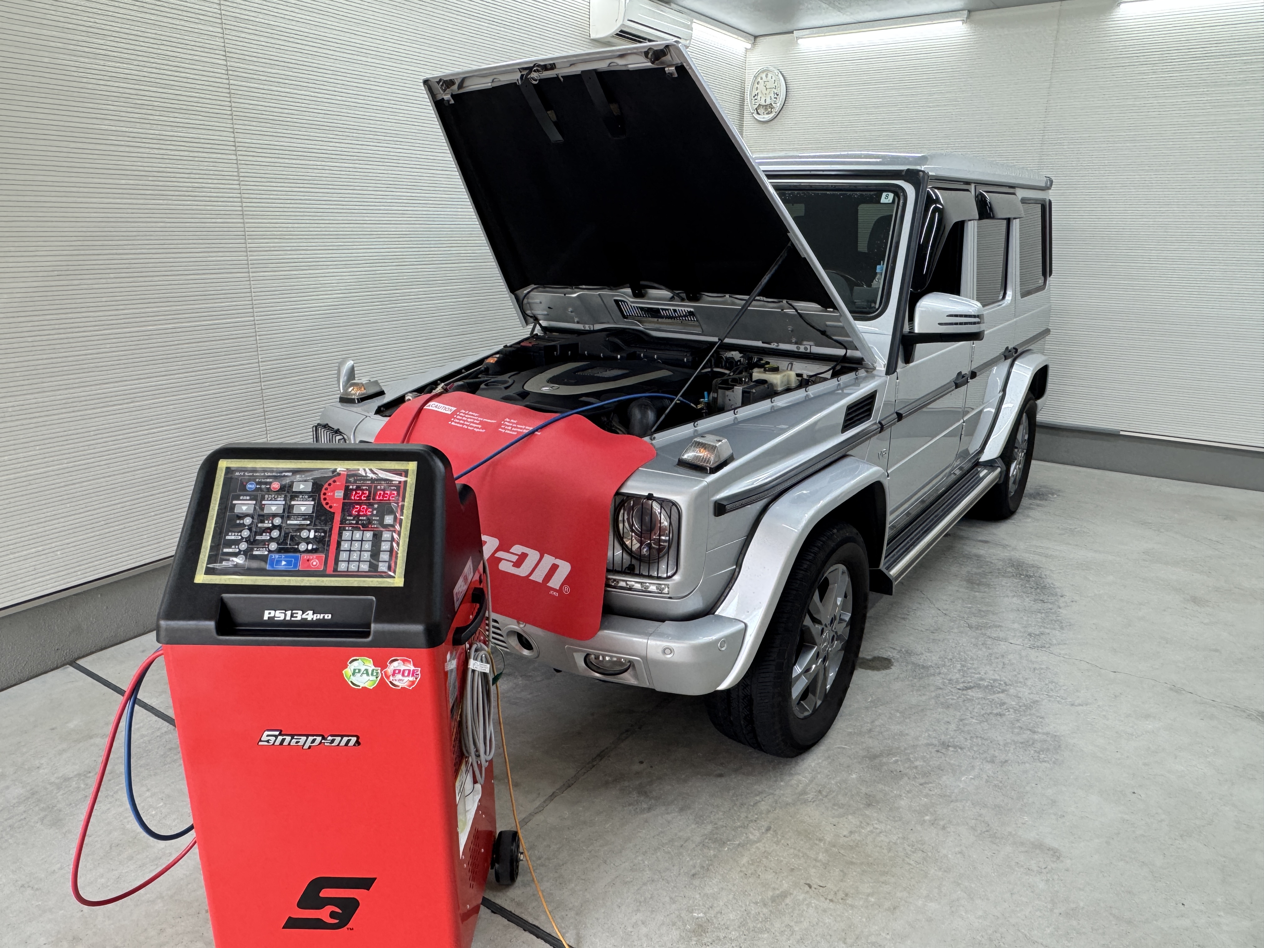 今回ご紹介のお車はメルセデスベンツG550になります。明日から旅行に行くとの事でエアコンガスのメンテナンスにお越し頂きました。メンテナンスになりますのでプランAをご案内し作業させて頂く事になりました。早速ですが恒例の吹出し口温度を確認させて頂きました。作業前は12.6℃と冷えておりましたが機械をセットし作業を進めさせて頂きます。お車のエアコンガス回収からスタートし待つ事1時間弱で作業完了となります。作業後は不純物が除去された高純度のエアコンガスが充填されエアコンシステムへの故障リスクが軽減されます。作業後はと言うと11.6℃と1℃下がりました。今回特に大きくガスが不足しているような事もなく正にメンテナンスと言う作業になりました。壊れてからでは時間もお金もたくさん必要になりますので不具合が無いなかでのメンテナンスはとても大切な作業です。弊社作業の前日にはディーラー様にてお車のメンテナンスをされており、本日11日は弊社でエアコンのメンテナンスとお出かけ前のメンテンスは万全のお客様。弊社作業の後にも再度ディーラー様にてトランスミッションのオイル交換を行うとの事でお車を大切にお乗り頂いている事がとっても伝わってまいります。メンテナンスの行き届いたお車で素敵な旅行になる事を祈っております。この度はありがとうございました。